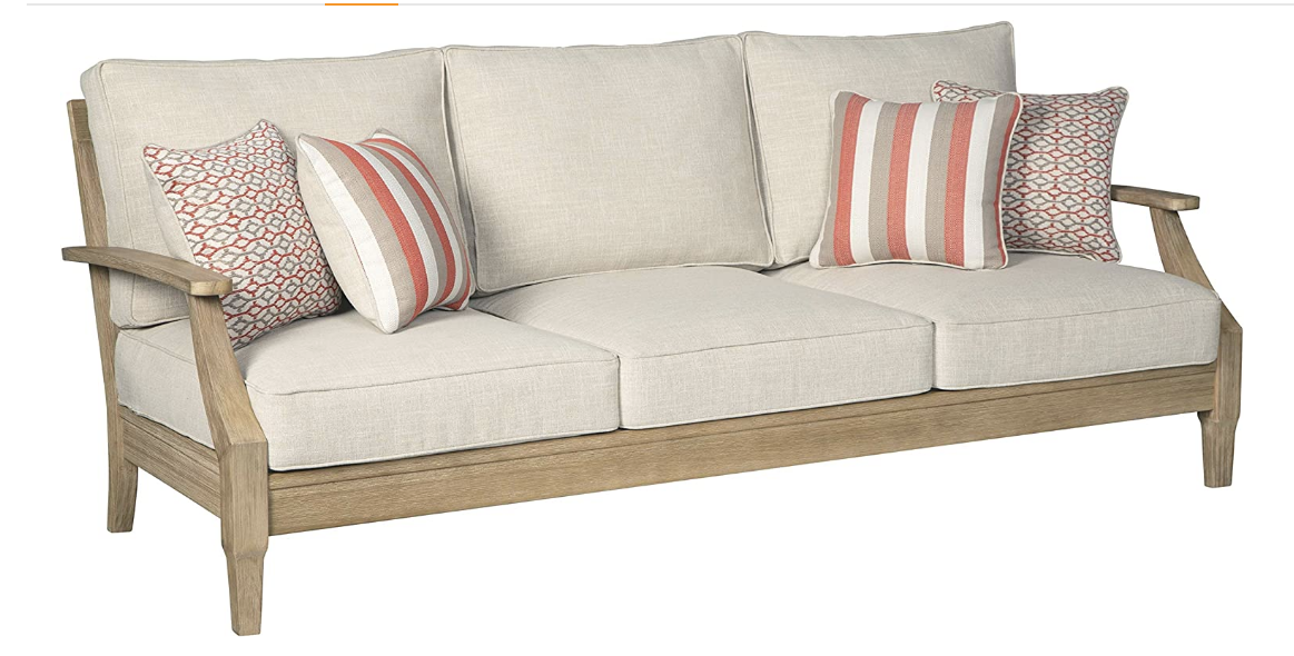 Description: Coastal Outdoor Patio Eucalyptus Sofa with Cushions, Beige Cushions