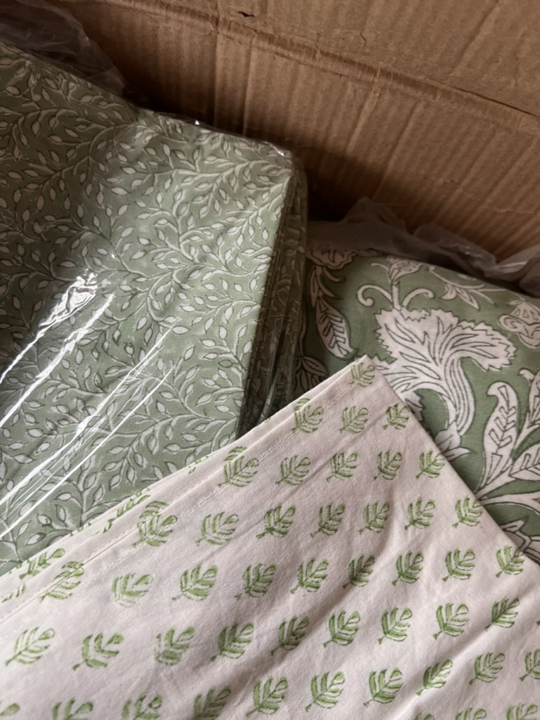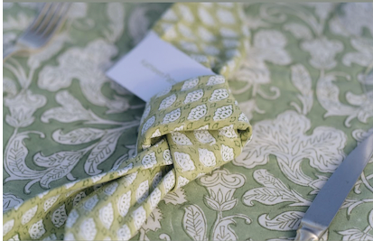 Description: This cotton block napkin comes in three different green and white patterns